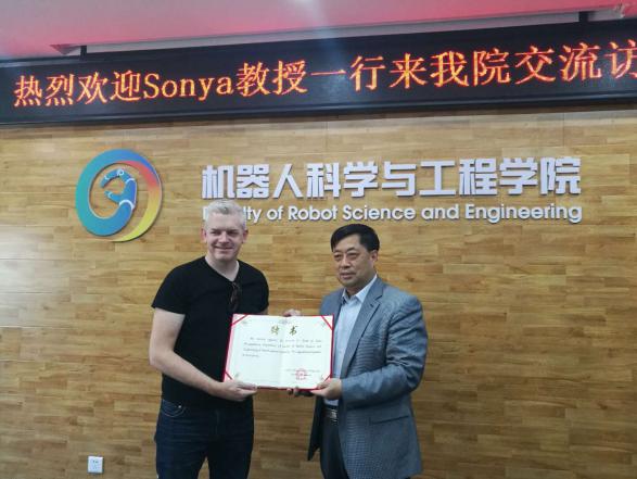 5月7日上午,Sonya教授一行5人来到了东北大学浑南校区机器人科学与工程学院与学院教师进行学术和教学交流。机器人学院常务副院长吴成东、副院长贾子熙以及方正、王斐等十余名学院骨干教师参与了会议。会议开始前,吴成东对Sonya教授一行的来访表示热烈欢迎,双方的互访增强了大家之间的合作交流。随后会议由贾子熙主持,吴成东分别给Sonya教授和Dermot教授颁发了东北大学机器人学院兼职教授的聘书,并预祝在未来的合作取得更多的成果。Sonya教授表示非常感谢东北大学及机器人学院给提供的合作机会,未来将在科研、教学、学生交流等各个方面进一步开展深入合作。