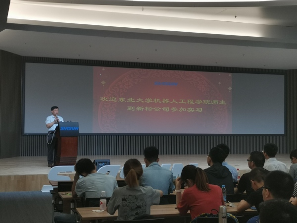 会上,吴成东教授感谢新松公司为本科生实习提供了优越条件,希望同学们把握好本次实习机会,从学中做,在做中学,保质保量完成此次实习任务。之后王晓东博士为同学们介绍了公司的基本情况,并重点介绍了公司的主要研究方向。最后宋吉来博士对实习场地——辽宁省先进技术重点实验室及实习课程安排进行了详细介绍。