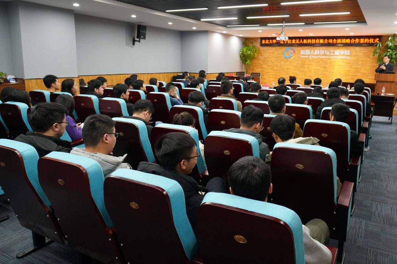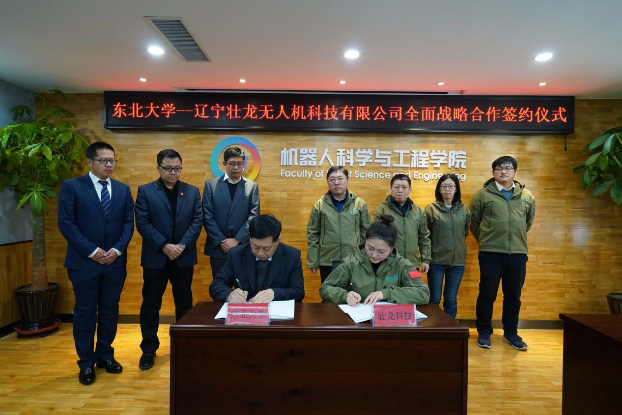 12月18日,东北大学--辽宁壮龙无人机科技有限公司(以下简称壮龙科技)全面战略合作签约仪式在浑南校区建筑学馆B座302报告厅成功举行。壮龙科技创始人、董事长张黎,副总经理刘长英,总经理助理陈明非,战略发展部项目经理齐维维,项目助理于海生,东北大学党委常委、副校长徐峰,对外联络与合作处副处长刘佳,机器人科学与工程学院常务副院长吴成东,副院长贾子熙、范松涛,院长助理姜杨及师生代表出席了本次签约仪式。