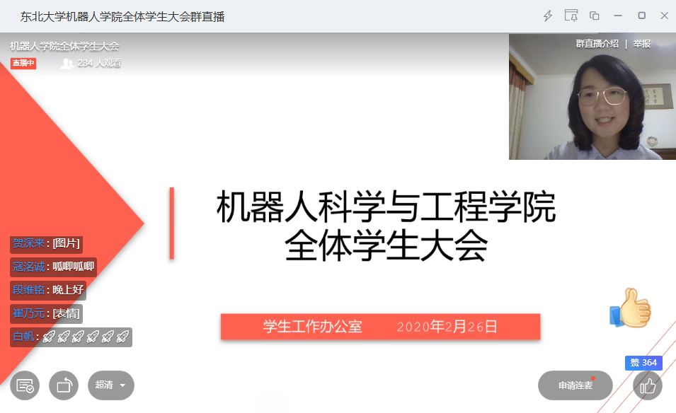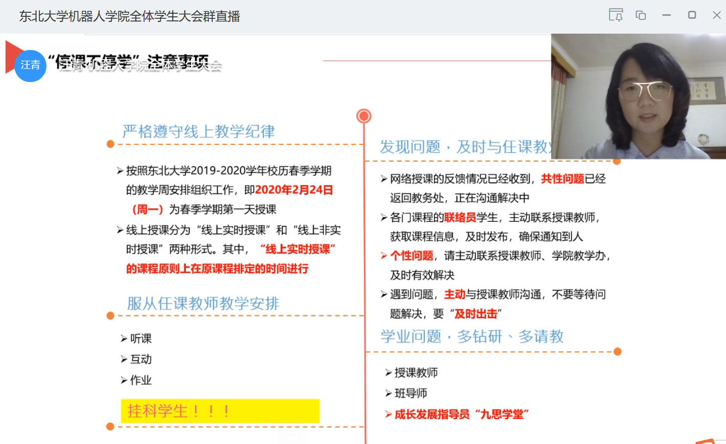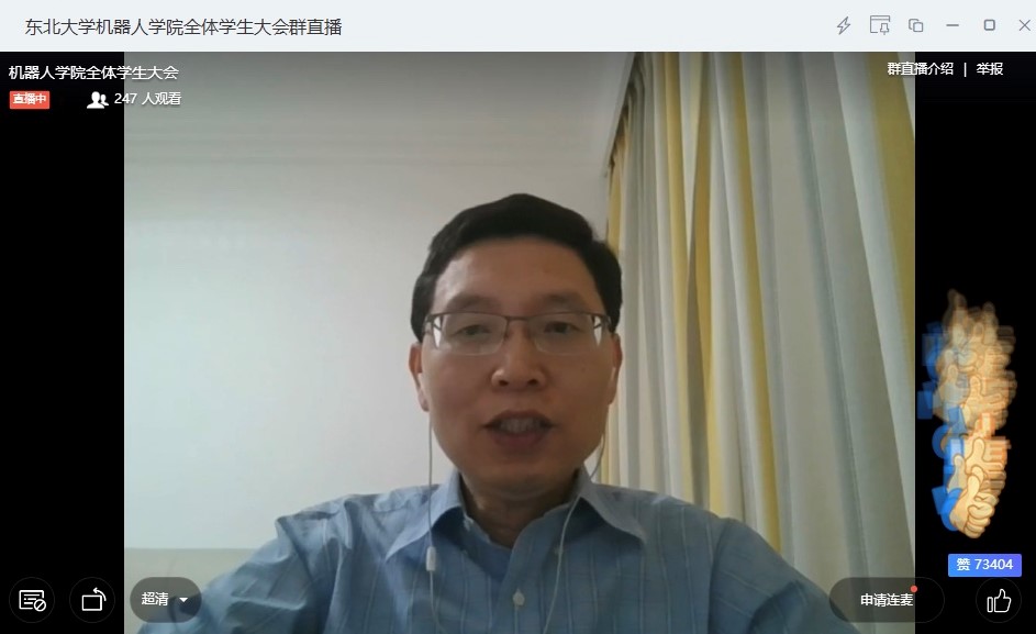 为深入贯彻习近平总书记对新型冠状病毒感染的肺炎疫情作出的重要指示精神和上级工作要求,按照东北大学疫情防控领导小组部署,切实保障广大师生健康安全,在疫情防控期间做好广大学生思想引领、在线学习、疫情防控等各方面工作,2月26日,机器人科学与工程学院通过钉钉平台举办全体学生大会。副院长严志刚出席会议,全体本科生参会。