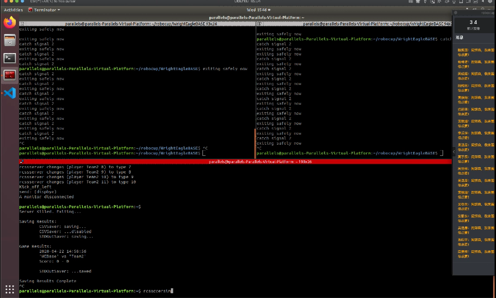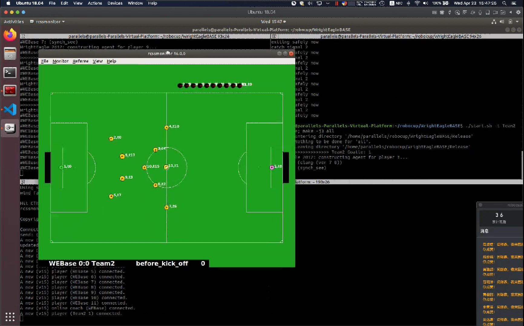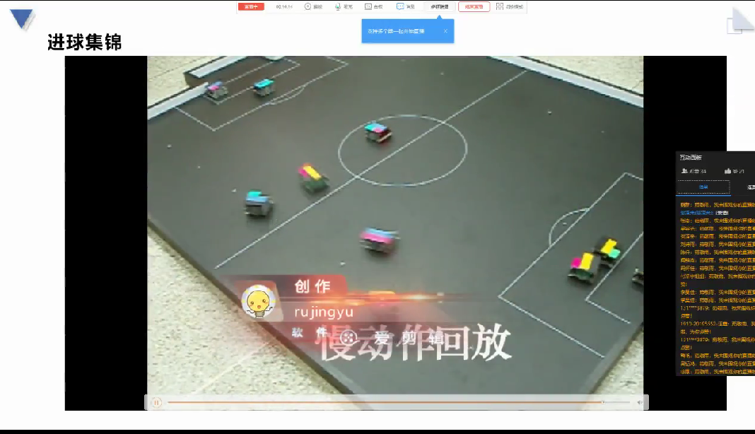 闻时光为全体学生带来满满的干货——比赛环境配置。他通过屏幕共享,直观简洁地介绍程序的安装方式,演示WrightEagle的具体操作方法。他介绍了软件赋予的比赛规则、对象的运动模式、代码的命令协议等相关操作。他实操代码,讲解具体函数,为所有同学答疑解惑。