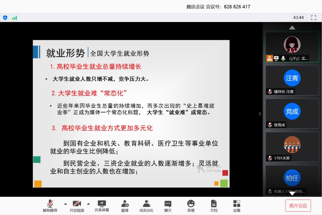 5月11日,机器人科学与工程学院在腾讯会议平台开展就业指导教育。学生工作办公室主任张孟新担任主讲教师,2017级本科生全体参会。