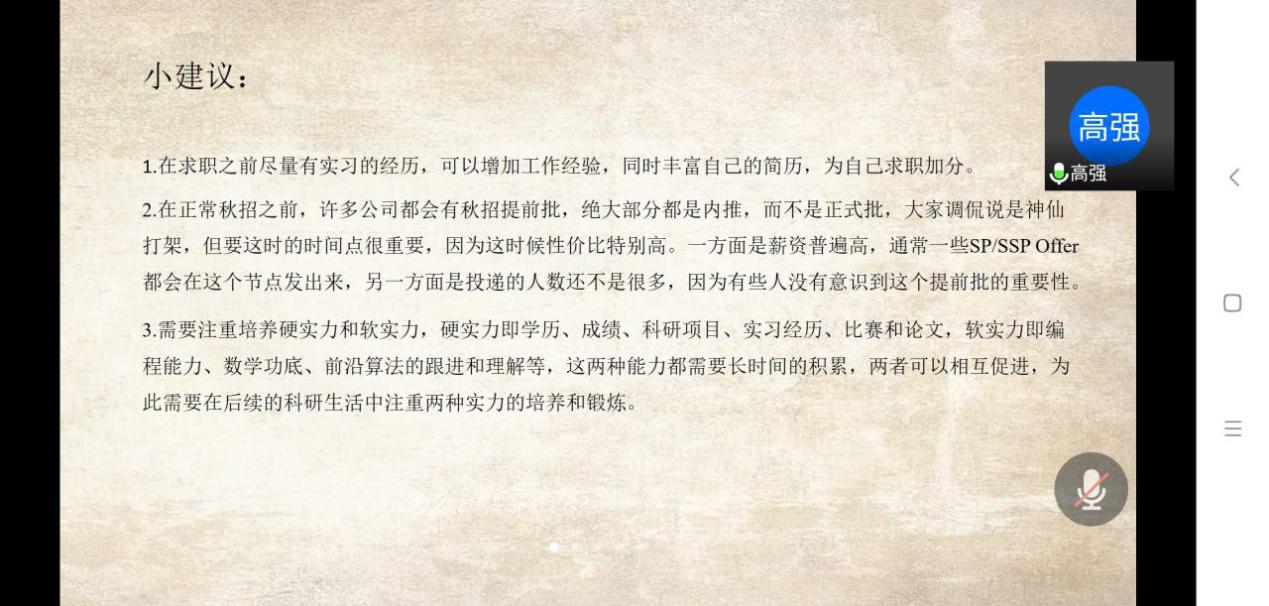 首先,高强同学根据自己的调研,对国内计算机视觉、自然语言处理、机器人、无人驾驶这四方面主要企业进行了阐述,并从理论知识和算法、论文研究和实践能力、编程和常用软件的技能等对求职方向和岗位要求进行了一定的分析,针对算法和研发等不同岗位的侧重点,建议大家根据自身情况来提早进行准备,为今后的科研工作做好规划。