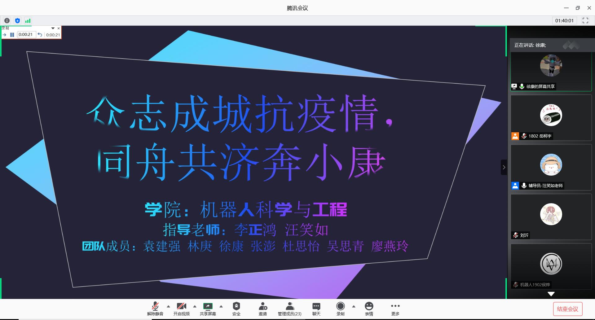 7月20日,机器人科学与工程学院通过腾讯会议平台举办2020年暑期社会实践答辩会。学生工作办公室主任张孟新、辅导员汪青出席会议。学院学生会代表作为评委出席活动。