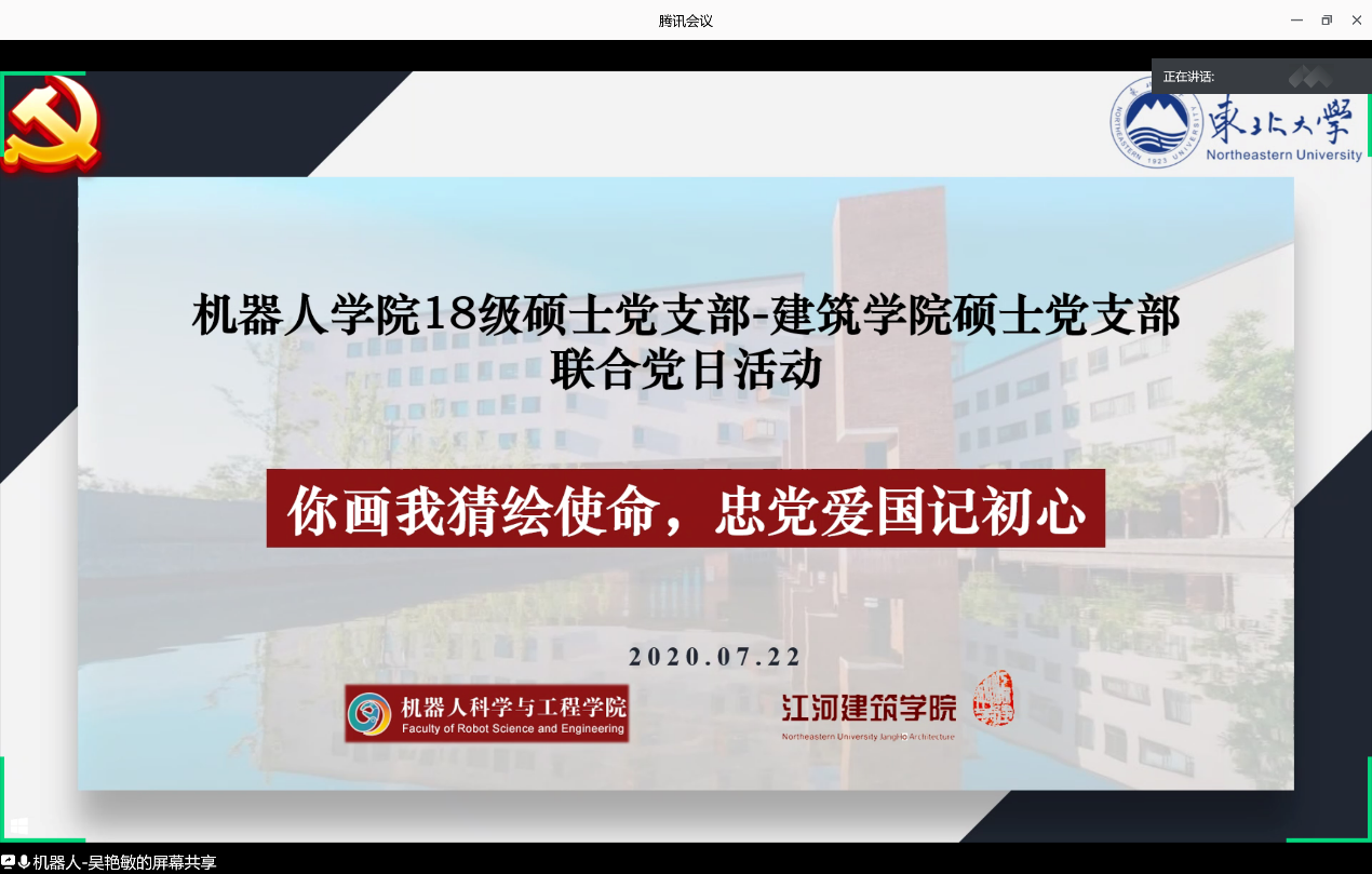 为加深支部党员对党史党规的认知,提升党性修养和思想觉悟,同时创新党日活动的开展形式,让党日活动真正地“活”起来、“动”起来,机器人学院2018级硕士生党支部与江河建筑学院硕士生党支部于7月22日晚,利用腾讯会议开展了以“你画我猜绘使命,忠党爱国记初心”为主题的线上联合党日活动。活动由机器人学院2018级硕士生党支部书记吴艳敏和江河建学院硕士生党支部组织委员娄森共同主持,两个支部全体党员共20人参加了此次活动。