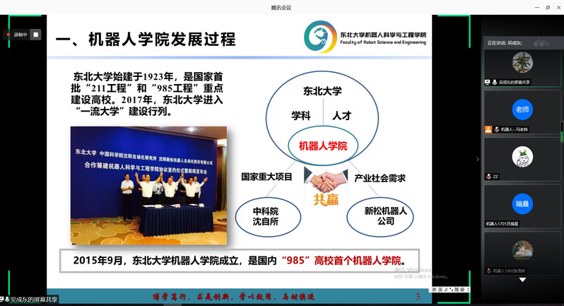 7月22日上午,机器人科学与工程学院研究生招生校内线上宣讲会成功举办,学院常务副院长吴成东、沈阳新松机器人股份有限公司中央研究院院长杜振军以及学院专任教师代表出席本次会议。会上,吴成东介绍了学院的学科建设、师资队伍、教学科研成果等情况,并展示了学院现有科研项目及平台。随后,杜振军介绍了新松公司的基本情况及兼职导师情况。最后,学院专任教师代表房立金、徐红丽、姜杨、王斐、方正、丁其川、王军义、王昊分别介绍了各自的科研团队及研究方向。此次线上宣讲会加深了学生对机器人学院的了解,活动反响强烈。