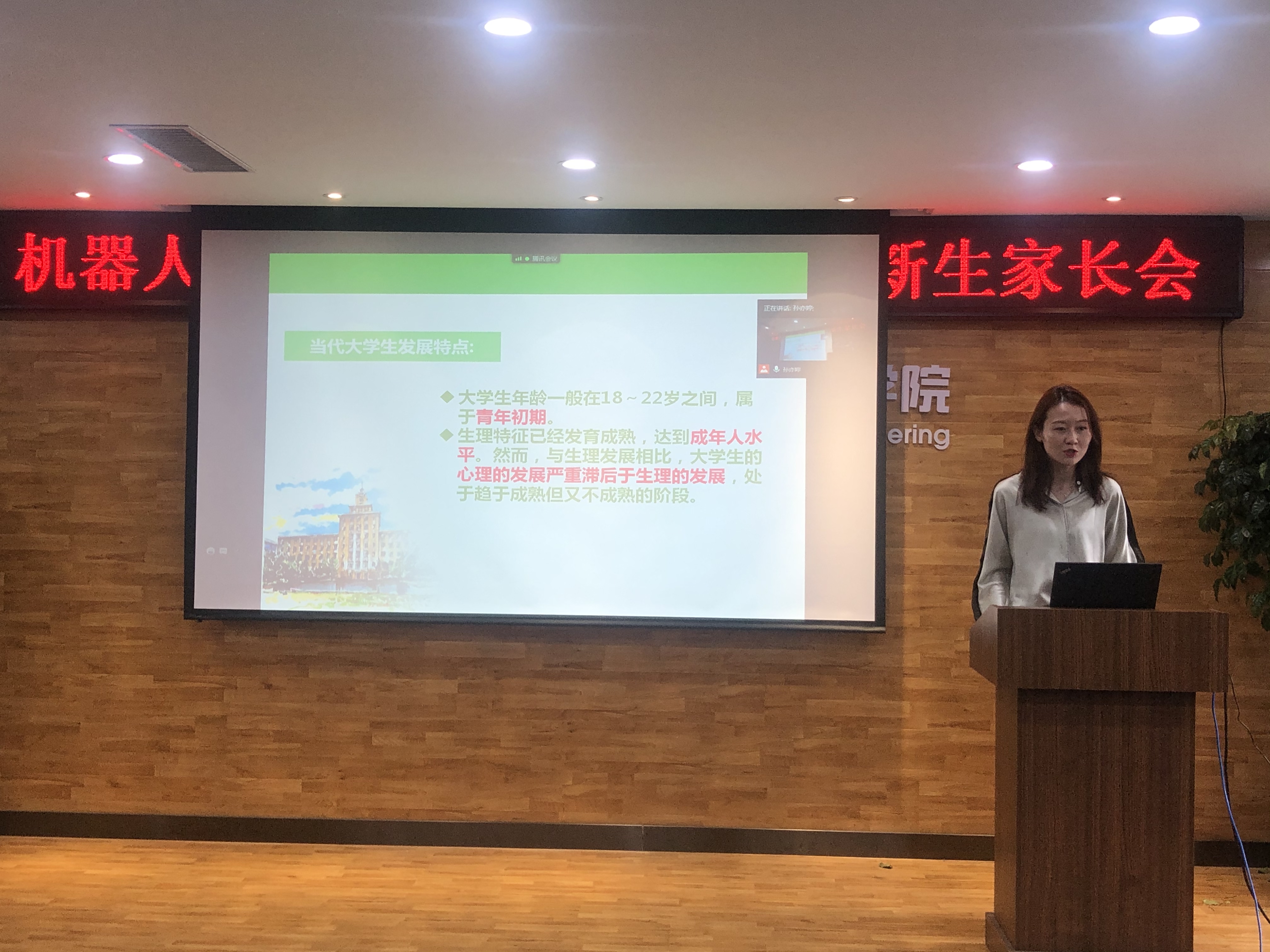 心理咨询中心老师武琳从大学生心理发展的特点、大学阶段常见的心理问题、学校在帮助学生心理成长方面所做的工作、家校携手关注学生成长成才四个方面,与家长展开交流,希望各位新生家长关注学生心理成长。