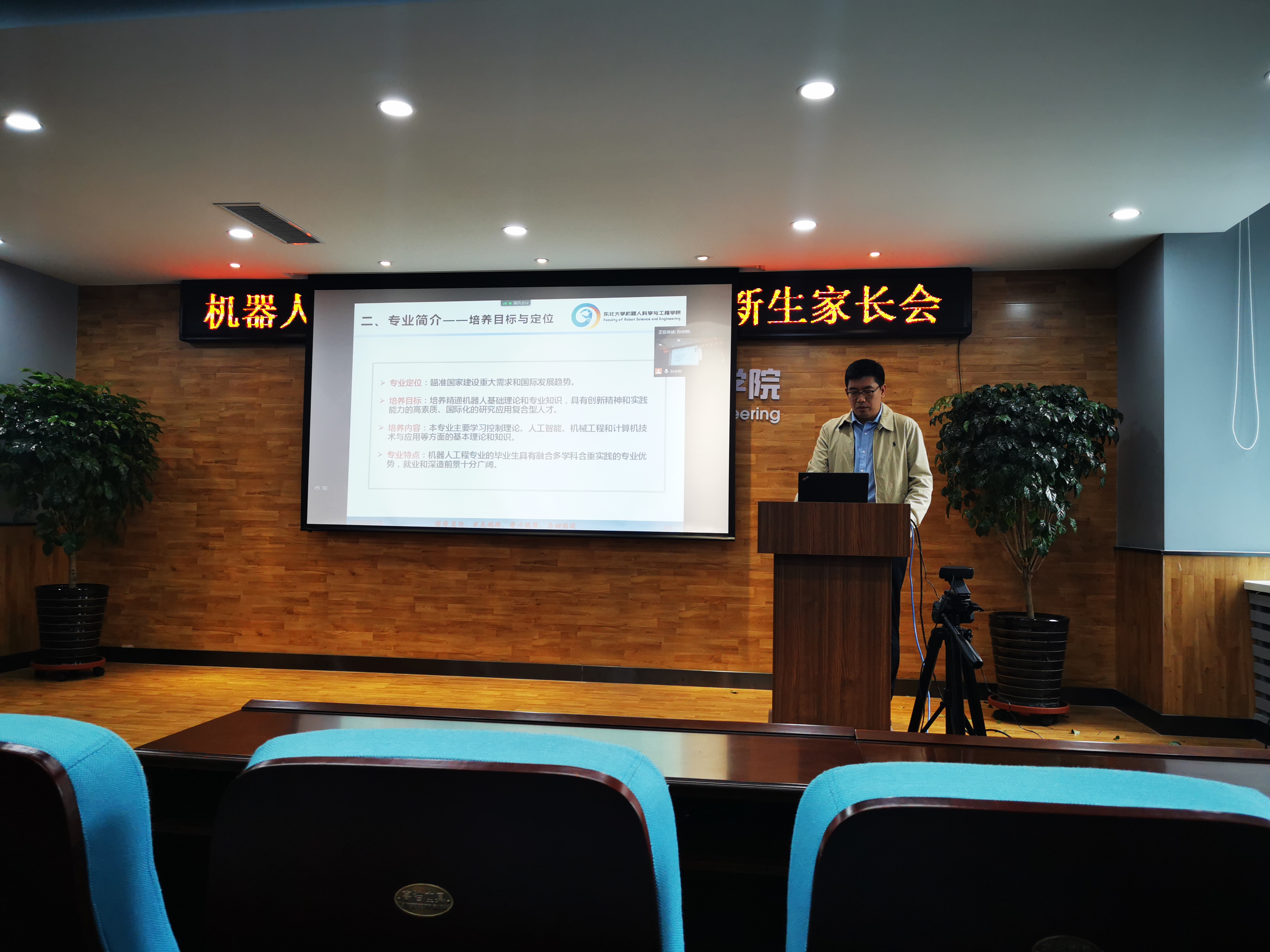严志刚围绕学院学生工作体系、学生综合素质培养、如何做好大学生家长三个方面,与家长进行交流。他表示,将学生们培养成才,是家长的殷切期望,更是学校的工作目标。家校应该共同努力帮助学生,完成由一个大孩子到一名大学生和年轻公民的角色转变,对自己的角色负责、对自己的选择负责,洞察机器人产业和区域的需求,将个人的生涯规划融入崛起的中国,融入时代,成为一个有大视野、大格局的大写的“人”。