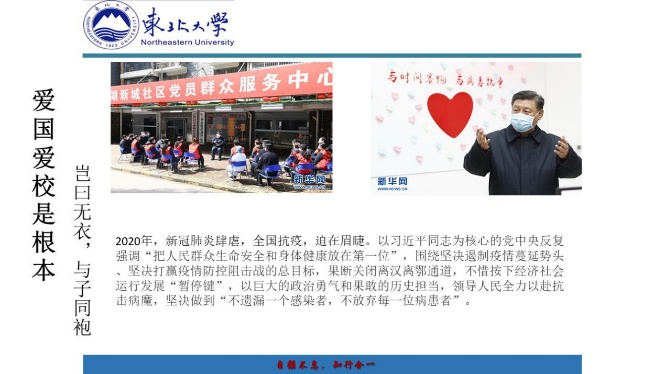 为增进学校认同感,9月17日,学院安排“校史校情”主题活动。通过组织新生们集体观看东北大学宣传视频、同唱校歌等形式,同学们了解了学校的悠久历史,感受到学校的沉稳作风,学习了学校的优秀文化,使东大“博学笃行”的形象更加深入人心,加强了同学们对于东北大学的归属感。
