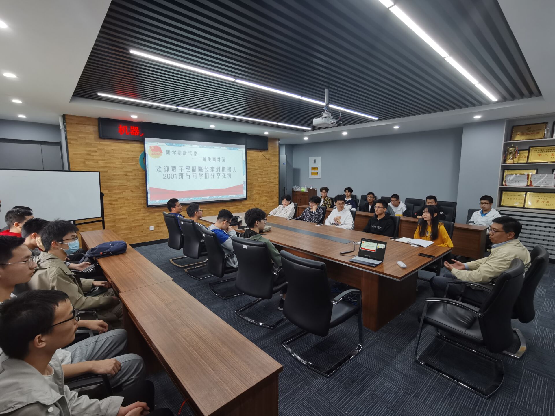 2021年9月23日16时,机器人学院副院长贾子熙走进机器人2001班,参与班级“请党放心•强国有我”主题团日活动,活动于建筑学馆B204室开展,2020级本科生辅导员孙亦婷以及班级全体同学参加。