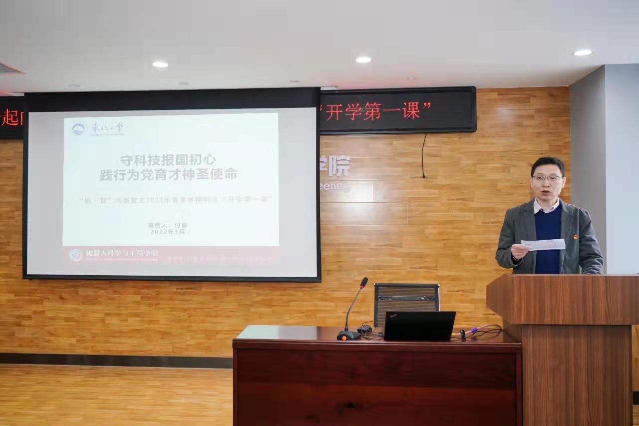 3月7日下午,东北大学“一五一十”思政文化育人一体化平台之“名家讲坛”暨机器人学院2022年春季学期“开学第一课”报告会在浑南校区建筑学馆B302成功举行。未来技术学院院长、机器人学院常务副院长付俊做报告,机器人学院全体师生参加。报告会采用线上线下相结合的方式,机器人学院副院长严志刚主持。