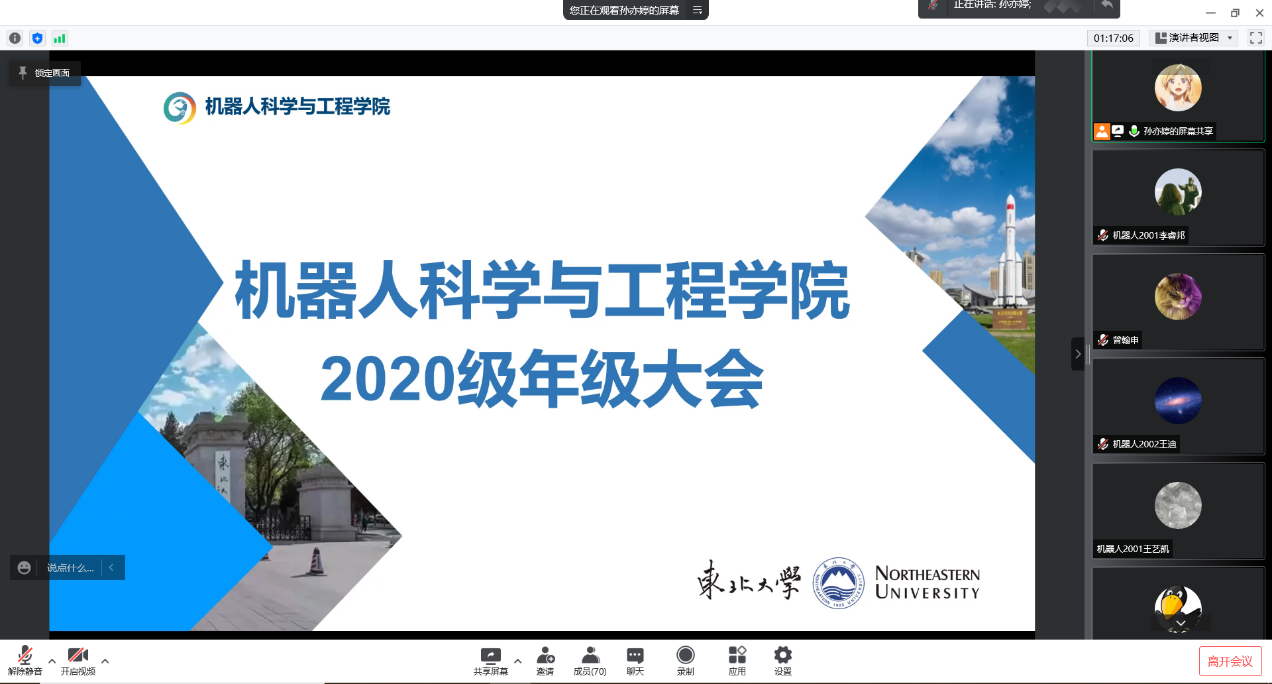 3月26日,机器人科学与工程学院2020级全体学生大会通过腾讯会议成功举办。机器人学院副院长贾子熙、机器人2001班班导师茹敬雨、2002班班导师张祥越、综合办副主任冯德慧出席会议,2020级全体学生参加会议,辅导员孙亦婷主持会议。