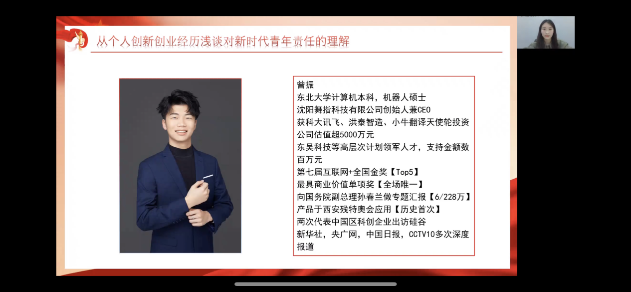 班会第三部分,首先由学院优秀硕士生,沈阳舞指科技有限公司创始人兼CEO曾振谈大学生的青年责任。