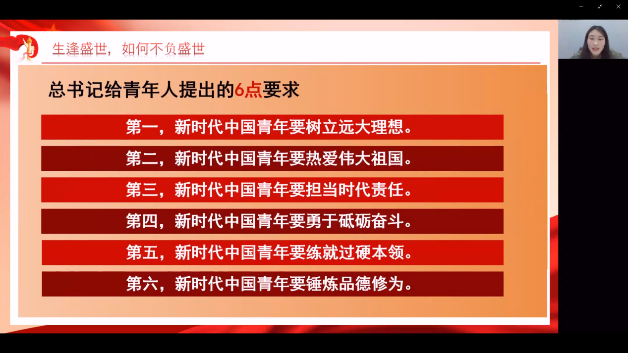“时代呼唤担当,民族振兴是青年的责任”。在第二部分,班级同学分享自己有所感悟的冬奥故事以及从中学到的优秀品质,王路宁结合习近平总书记对青年的六点要求,总结表示:首先青年人应该不忘初心,树立远大理想;有了理想目标,要砥砺奋斗,通过不断地努力才能更好地担当起时代责任;在努力的过程中,遇到失败时,要始终有一颗不服输,敢于超越的心,永不言败,迎难而上,练就过硬本领;除此之外,还应具备甘于奉献的精神,不断加强个人修养,锤炼品德修为,成为德才兼备的有志青年。同时,这一切的一切都有一个核心的前提,就是永远热爱伟大的祖国。