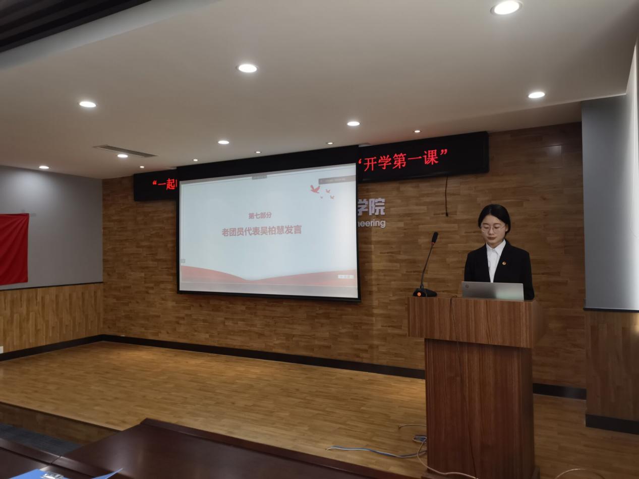 会议第六项,新团员发言。房文瑄同学陈述了自己向着团组织靠拢的过程,并承诺自己会继续积极要求进步,充分发挥团员的模范带头作用。