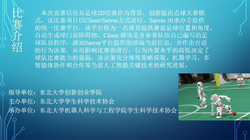 本次竞赛以仿真足球2D比赛作为背景,并创新提出点球大赛,该比赛项目以Client/Server方式进行。在比赛过程中,参赛队伍需要设计战术、紧密配合,通过冲击球门、边路传中、包夹、绝杀等精彩操作,最终完成全部比赛内容。本次校内赛旨在选拔包括机器人、人工智能等专业在内的优秀的学生团队,为代表东北大学备战2022年中国机器人大赛提供人才储备。