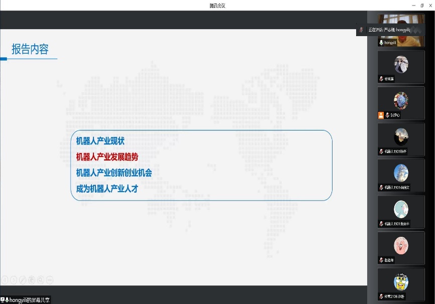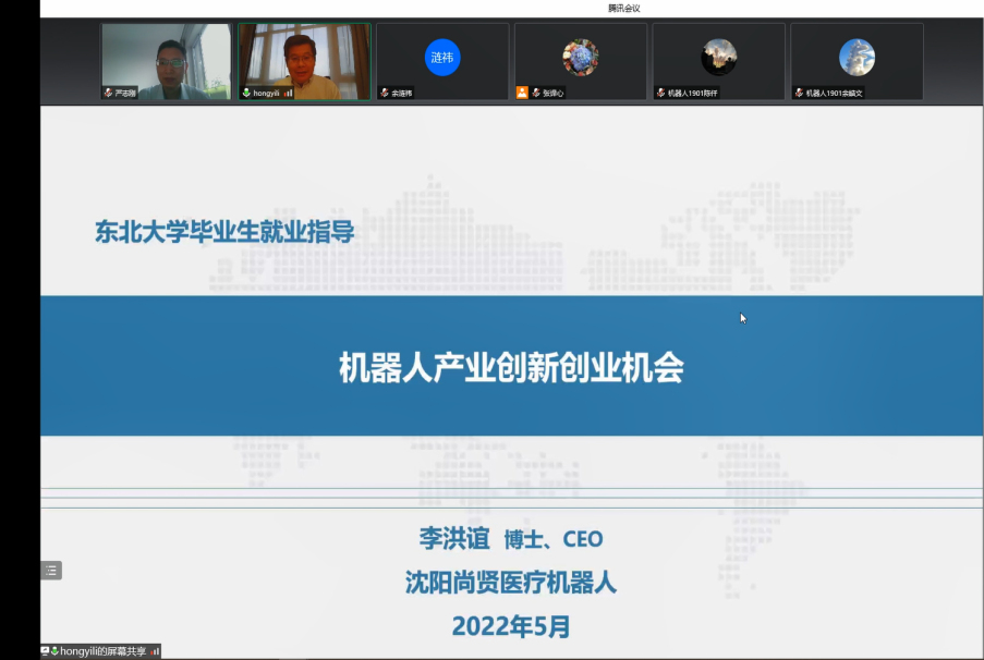 5月27日,东北大学NEU职涯云课之“机器人产业创新创业机会”主题报告会通过腾讯会议举办,沈阳尚贤医疗机器人CEO李洪谊应邀作报告。报告会由东北大学学生指导服务中心主办、机器人科学与工程学院承办。包括机器人学院在内的全校各学院学生200余人参加会议。会议由机器人学院副院长严志刚主持。