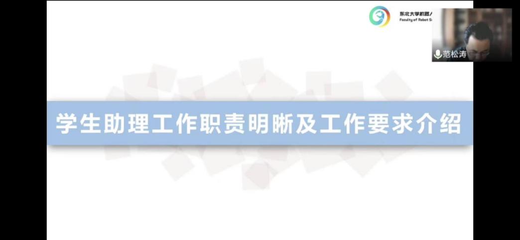 范松涛介绍了学生助理工作职责及工作要求,并希望大家能够在今后的工作中牢记岗位职责,脚踏实地,锻炼自我,有所收获。
