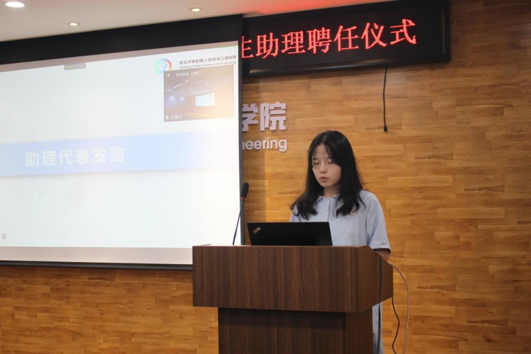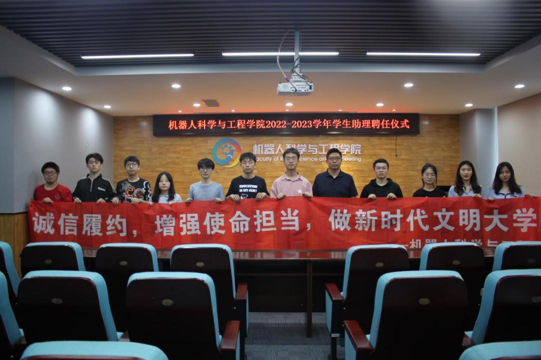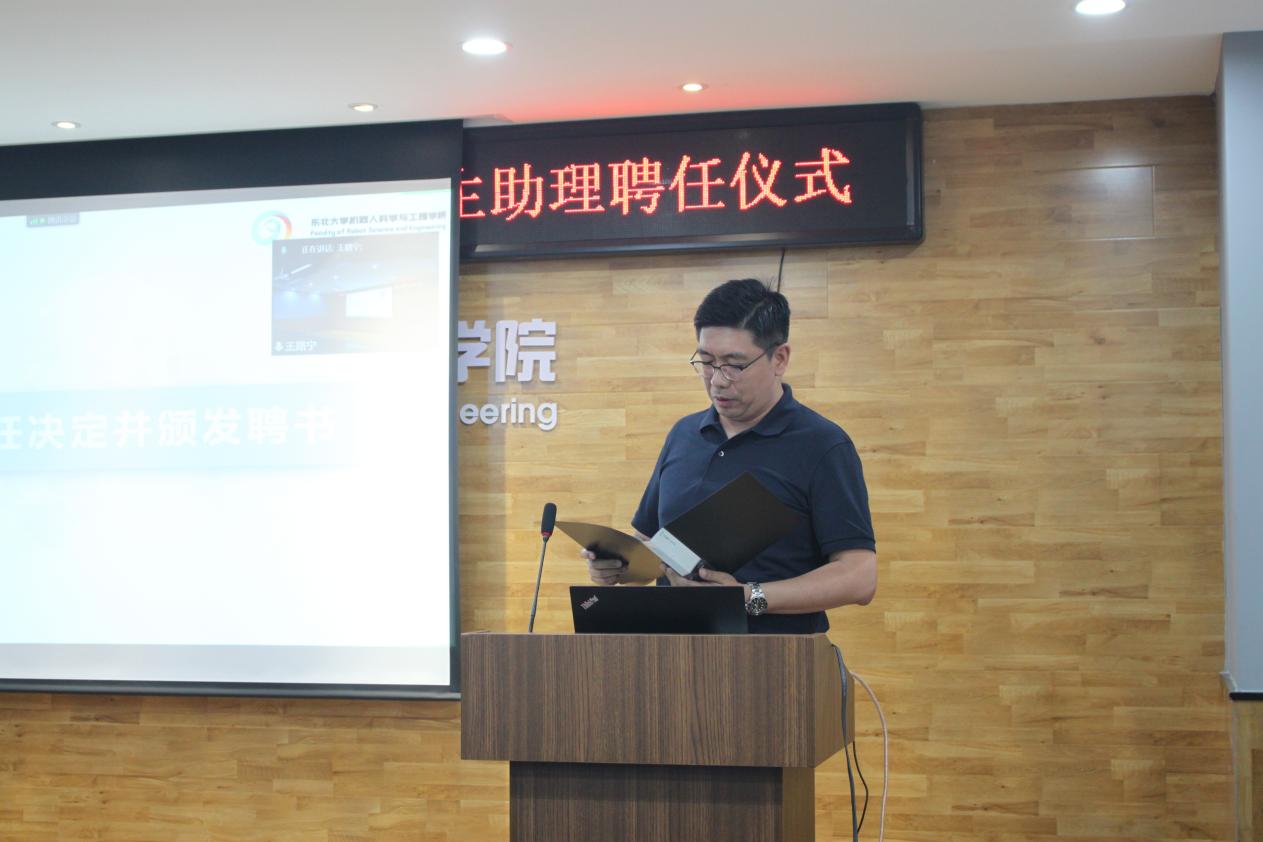 贾子熙首先宣读了《关于机器人科学与工程学院2022-2023学年学生助理聘任的决定》并为九名学生助理颁发聘书。