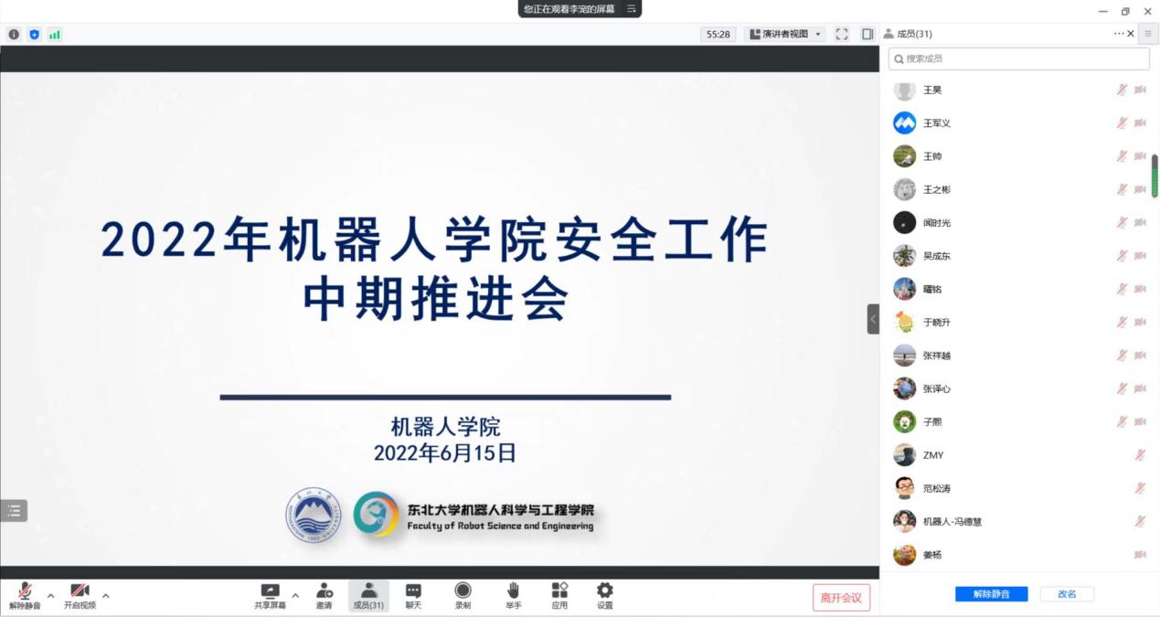 6月15日下午,机器人学院在浑南校区建筑学馆B座204召开2022年度安全工作中期推进会,会议以线上线下相结合的方式进行,学院安全工作主管副院长范松涛、实验室安全主管副院长贾子熙、学生安全工作主管副院长严志刚,学院安全员李宠出席会议,学院全体教职工参加本次会议,会议由范松涛主持。