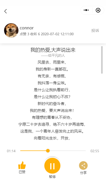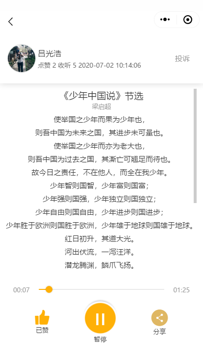 最后分享的作品则展现了作为新时代青年的责任与担当。吕光浩为大家带来了梁启超的《少年中国说》节选,分享了自己对于少年的认识,鼓舞大家珍惜少年时,有理想、有担当,不负习近平总书记的嘱托。王帅则融入了自己作为一名普通学生党员投身和见证新时代的满腔热情,朗读了《我的热爱,大声说出来》,号召同志们积极参与到“新基建”等专业对口、对国家意义重大的工作中,为中华民族的伟大复兴增砖添瓦。
