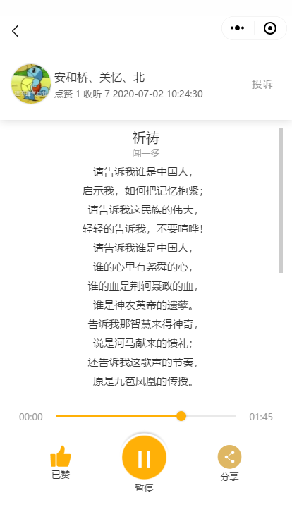 活动中,每名同志播放了本人诵读的爱国主义经典诗篇的录音,并分享了与所选作品相关的背景故事。首先是革命战争年代的作品分享。吴艳敏声情并茂地朗读了闻一多先生的《祈祷》,分析了闻一多作为一名爱国民主人士,在大革命失败、国家前途道路迷茫时,对“中国人”三个字的深入思考、对民族复兴的渴望。周思帆朗读的是端木蕻良的《嘉陵江上》,分享了端木蕻良的生平事迹和诗篇创作缘由,带领大家体会了作者对日寇的愤恨和对故乡的思念。李奇为大家带来的是叶挺先生的《囚歌》,介绍了作品创作时反动派的丑陋行径,致敬老一辈革命家宁为玉碎、不为瓦全的高尚节操和英雄气概。