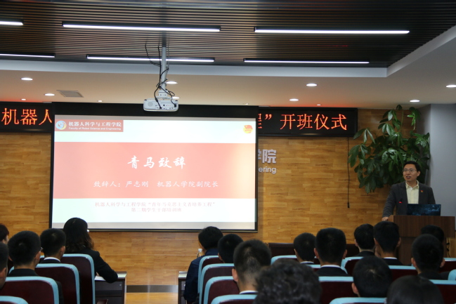 严志刚首先致辞,从《未来简史》入手,指出,作为人工智能的最佳载体,机器人专业的同学们应该学好马克思主义这一关系到全人类彻底解放的学说。他总结了往期青马的优良传统,指出了学生工作中需要突破的难点,寄语青马学员传承追求卓越的精神、舍我其谁的担当、善于总结的习惯。