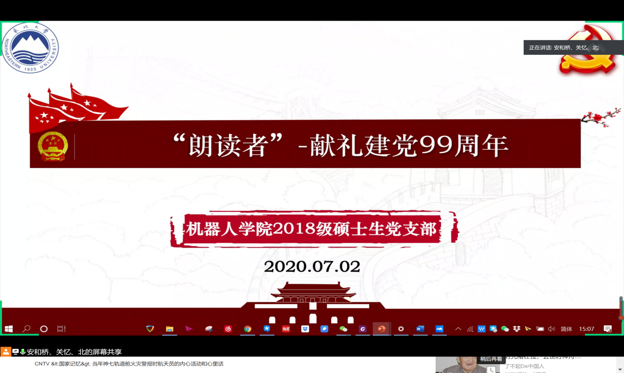 为砥砺复兴之志、永葆赤子之心,庆祝建党99周年,机器人科学与工程学院2018级硕士生党支部于2020年7月2日下午,以线上会议形式开展了“朗读者——献礼建党99周年”主题党日活动。活动由支部书记吴艳敏主持,支部全体党员参与了此次活动。