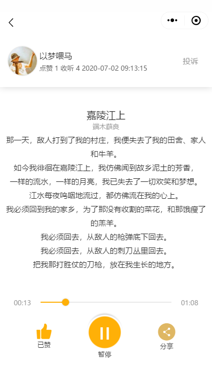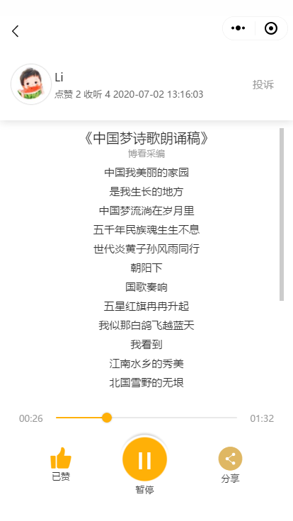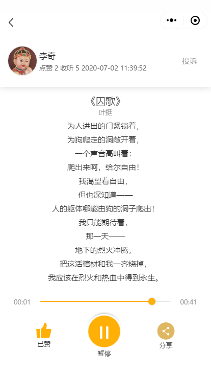 活动中,每名同志播放了本人诵读的爱国主义经典诗篇的录音,并分享了与所选作品相关的背景故事。首先是革命战争年代的作品分享。吴艳敏声情并茂地朗读了闻一多先生的《祈祷》,分析了闻一多作为一名爱国民主人士,在大革命失败、国家前途道路迷茫时,对“中国人”三个字的深入思考、对民族复兴的渴望。周思帆朗读的是端木蕻良的《嘉陵江上》,分享了端木蕻良的生平事迹和诗篇创作缘由,带领大家体会了作者对日寇的愤恨和对故乡的思念。李奇为大家带来的是叶挺先生的《囚歌》,介绍了作品创作时反动派的丑陋行径,致敬老一辈革命家宁为玉碎、不为瓦全的高尚节操和英雄气概。