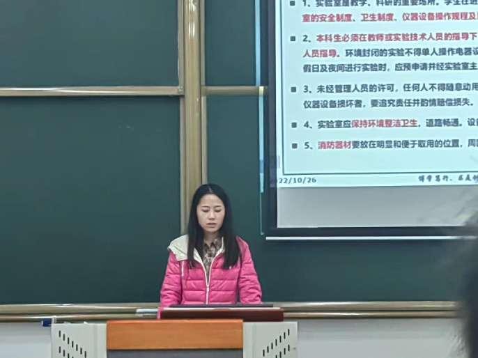 会上,王思佳为2022级新生介绍学院基本情况,并从安全标准化建设、消防安全、人走断电、房间借用、实验室准入等方面为2022级全体新生进行安全教育。随后,李星扬分别从学院实验室介绍、实验室安全规范内容、实验室安全注意事项以及实验室准入制度四部分进行讲解,其中主要强调了学院实验室准入制度,并提醒同学们按时完成实验室安全在线学习,并准时完成线上考试、签署安全责任承诺书。