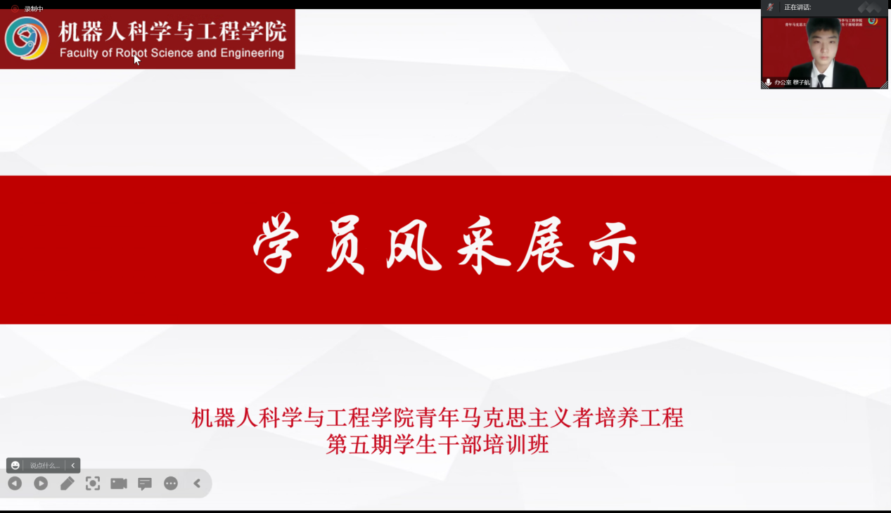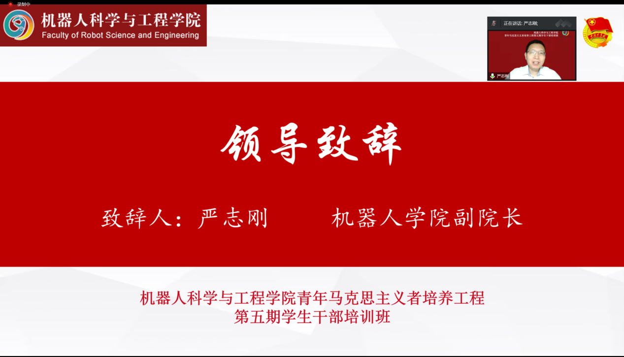 11月24日,机器人科学与工程学院青年马克思主义者培养工程第五期学生干部培训班开班仪式通过腾讯会议成功举办。机器人学院副院长严志刚出席会议,全体辅导员和学生干部参加会议。