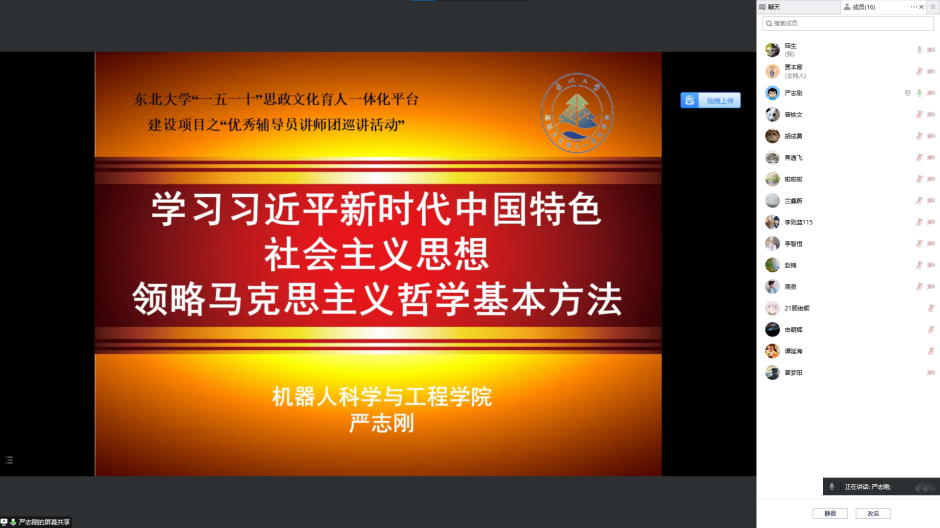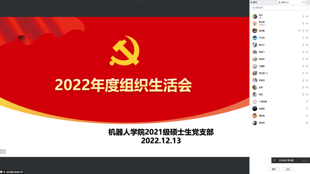 12月13日,机器人科学与工程学院2021级硕士党支部通过腾讯会议召开2022年度组织生活会。机器人学院副院长严志刚出席会议,党支部所有成员参加会议。会议由党支部书记贾本卿主持。
