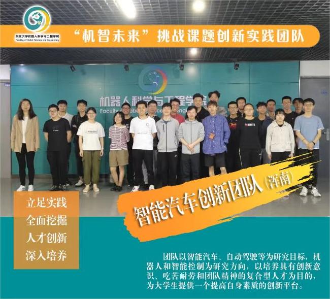 智能车创新团队(浑南)于2018年11月建立,团队以智能汽车、自动驾驶等为研究目标,机器人和智能控制为研究方向。团队谨遵学校“自强不息,知行合一”的东北大学校训,追求理论与实践相结合,通过参加不断超越自我的智能车竞赛,特别磨砺学生的韧性和创新精神,培养学生具备刻苦勤奋的意志品质。团队实行学生自我管理、指导老师定期监督指导的管理制度。团队主要在嵌入式系统流程设计实施,控制系统分析设计调试方面具有丰富经验。