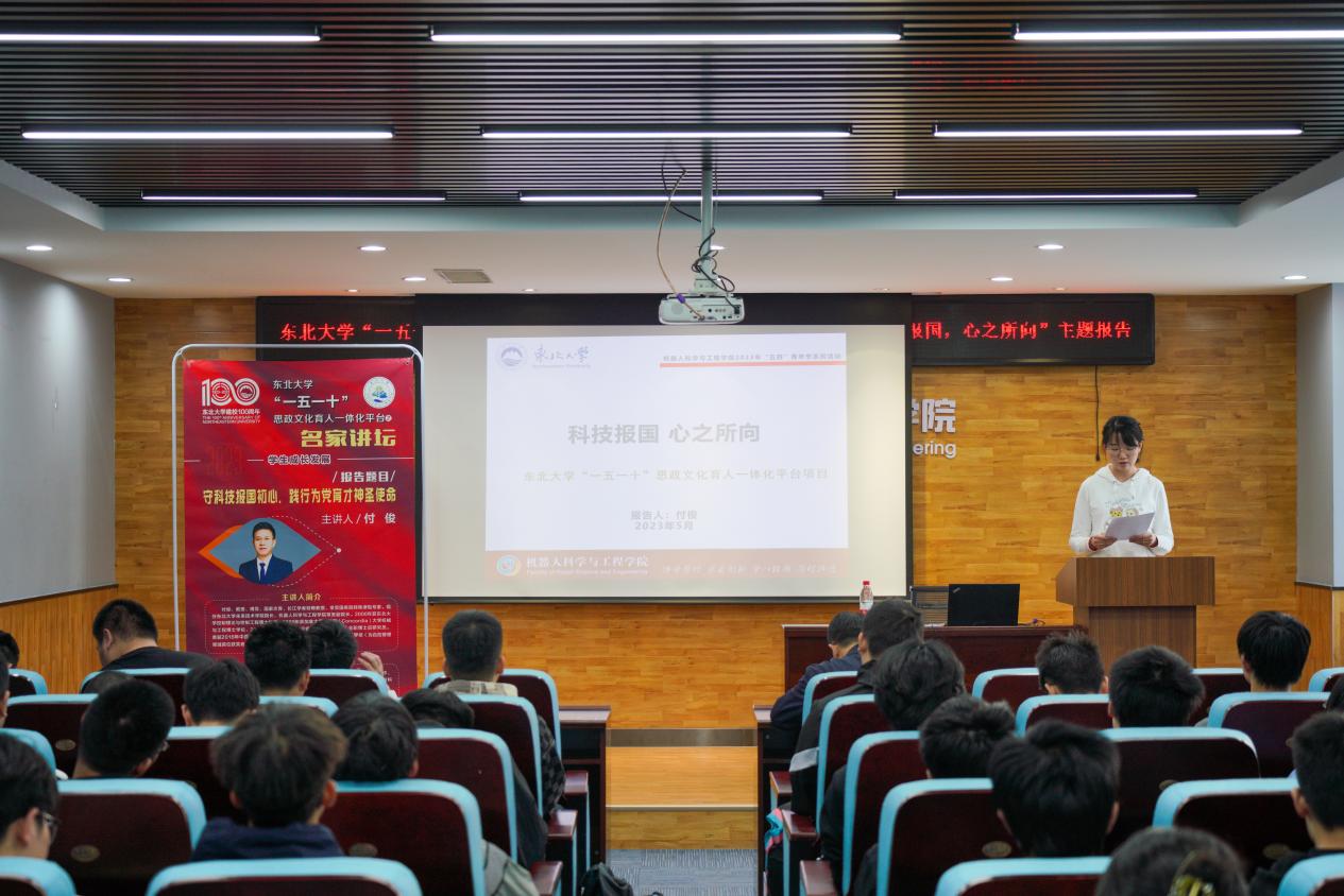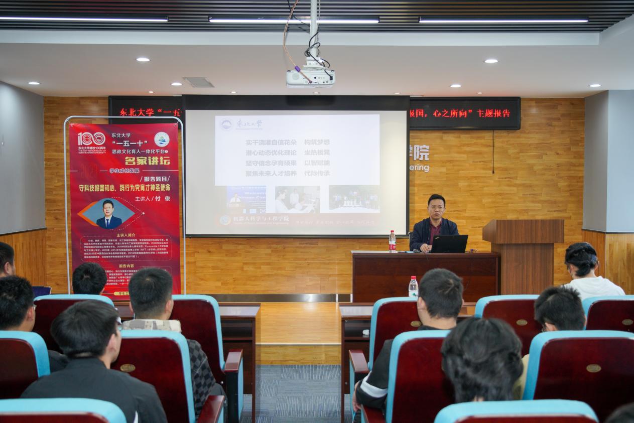 5月5日,机器人科学与工程学院在浑南校区建筑学馆B302举办东北大学“一五一十”思政文化育人一体化平台之名家讲坛。未来技术学院院长、机器人学院常务副院长付俊作“科技报国,心之所向”主题报告。2022级全体本科生参会。