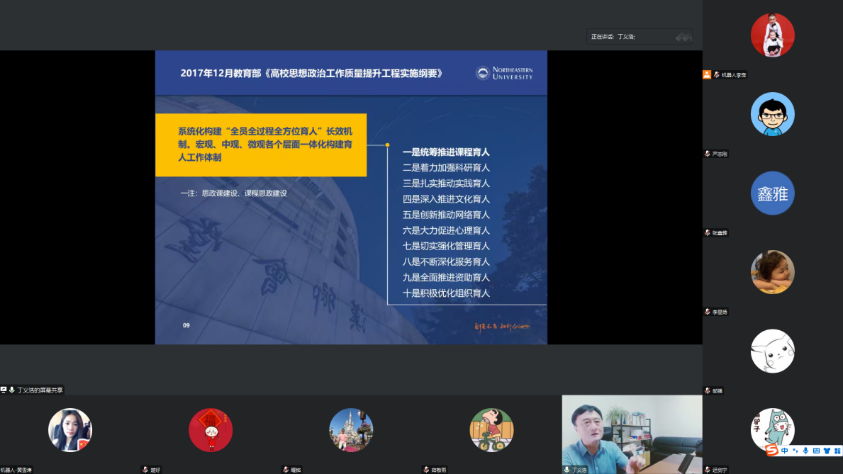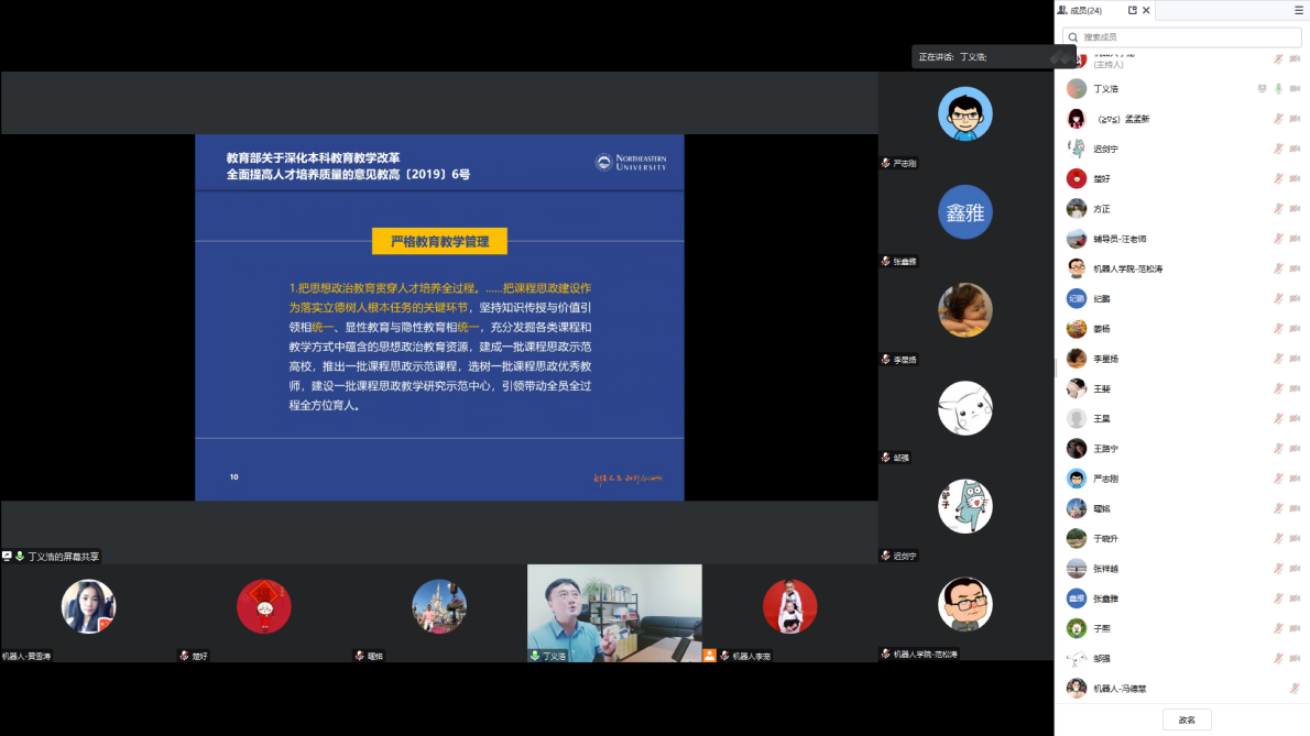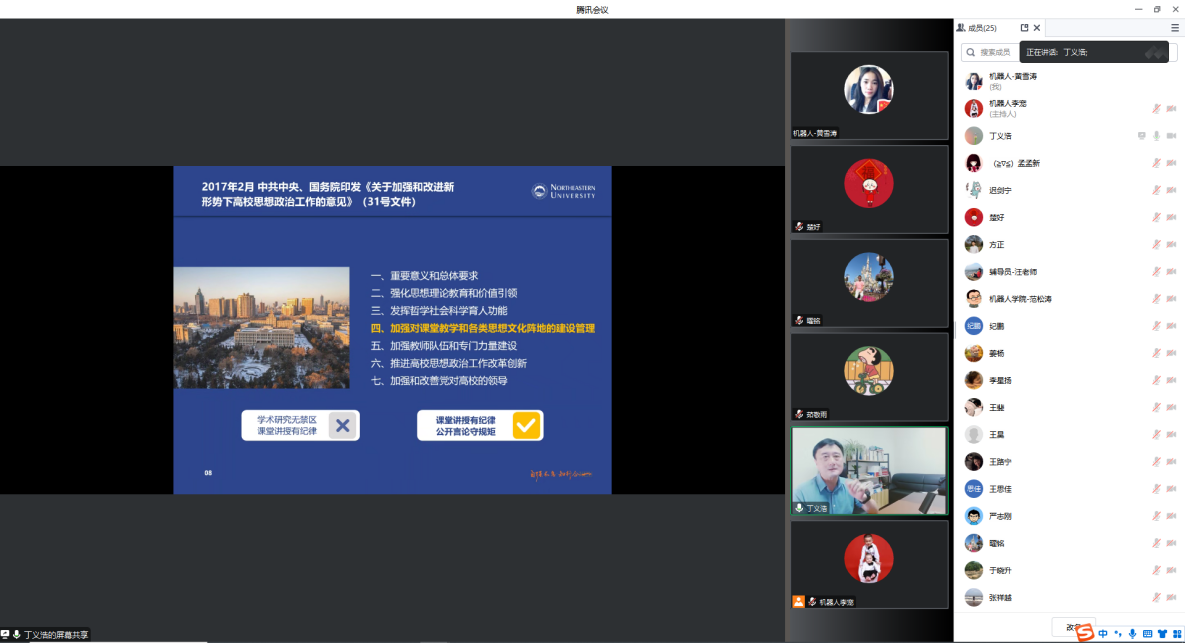 6月7日晚,机器人学院课程思政建设报告会暨教师沙龙活动通过线上腾讯会议成功举办。东北大学马克思主义学院教授、研究生院副院长兼党委研究生工作部部长,教育部(东北大学)课程思政教学研究中心负责人丁义浩教授,机器人学院副院长贾子熙、范松涛、严志刚及学院全体教职工参加本次会议。会议由严志刚主持。