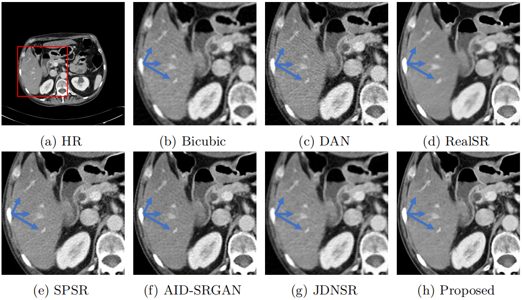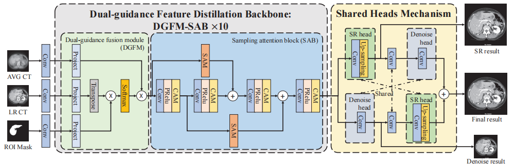 该论文提出了基于分割掩膜与平均CT图像引导的CT图像质量增强网络(图1),网络通过迭代引导与特征蒸馏模块挖掘低剂量CT图像语义特征,并通过新颖的“去噪-超分辨率”共享头机制提升了伪影噪声去除能力与高分辨率图像重建能力。相较于近年方法,提出方法在参数量、重建效果等方面具有明显优势,为下游任务奠定基础(图2)。