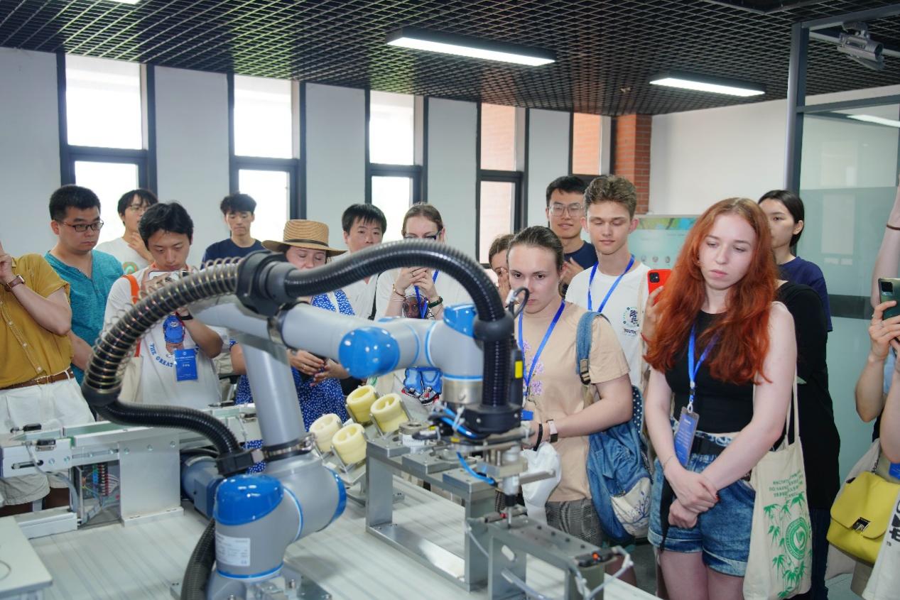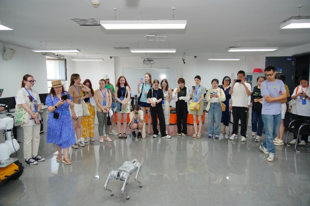 贾子熙首先代表学院致欢迎辞,对白俄罗斯同学的到来表示热烈欢迎,并就学院的发展历程、人才培养模式和主要研究方向等总体情况进行了介绍。随后,贾子熙带领学生代表团先后参观了东北大学智能车实验室、机器人学院本科教学实验室、智能协作机器人联合实验室以及学科公共实验室。实验室同学们基于智能车、装配机器人、四足机器人等设备向来访的学生进行了相关机器人技术介绍和功能展示。学生代表对机器人表现出了极大兴趣,充分体验了人机互动,学习了各种机器人的相关知识。