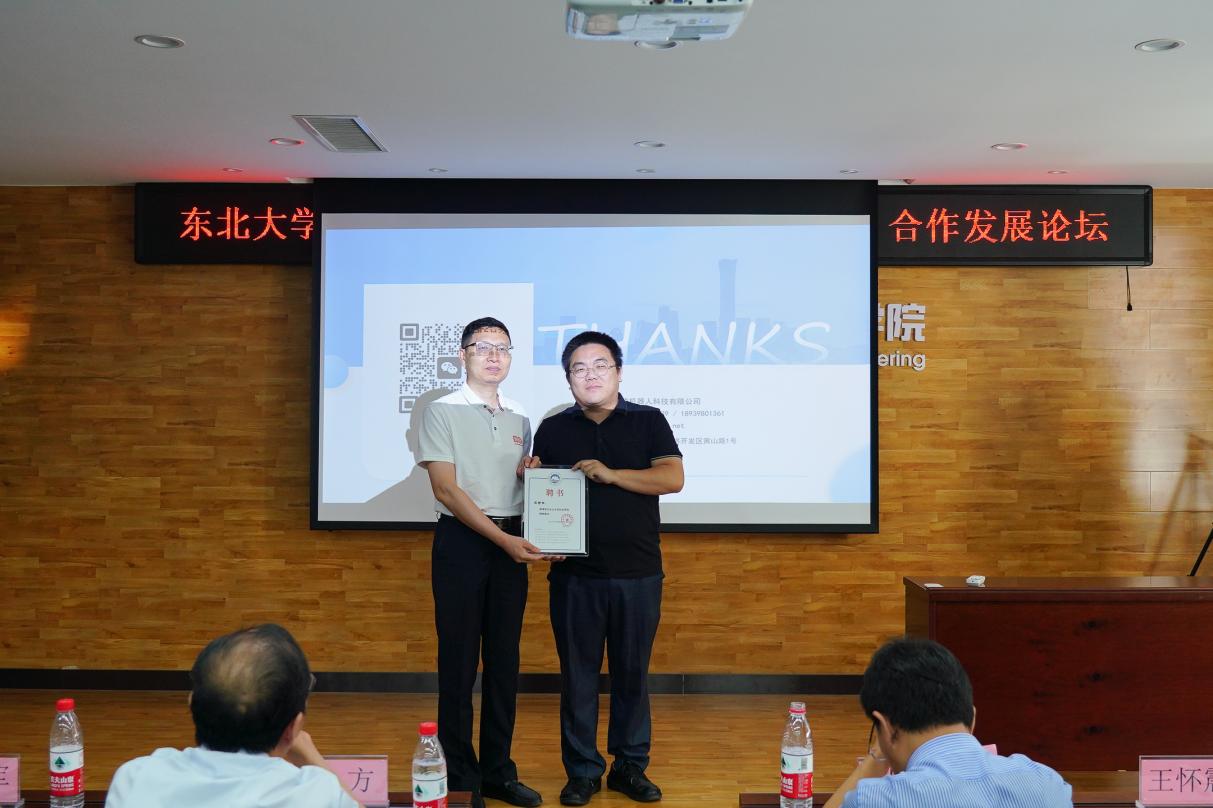 论坛结束后,机器人学院副院长严志刚为东北大学创业导师颁发聘任证书,东软集团股份有限公司代表上台领取证书。