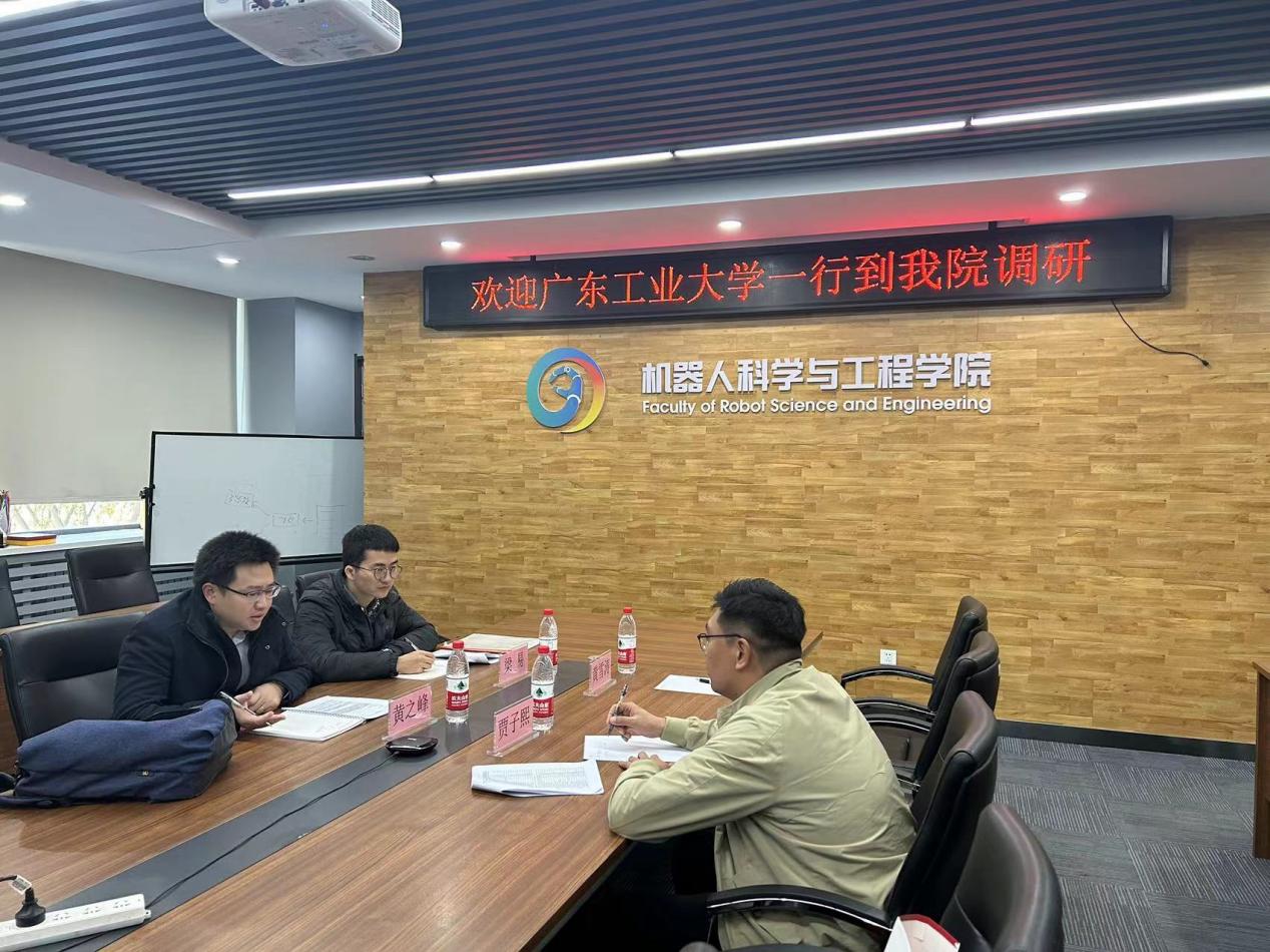 2023年10月20日上午,广东工业大学自动化学院自动系副主任黄之峰、专职辅导员梁易一行二人到机器人科学与工程学院调研,机器人学院副院长贾子熙、教学秘书黄雪涛参会。贾子熙对黄之峰一行来访表示热烈欢迎,并详细介绍了我院机器人工程专业建设、人才培养等方面的情况。黄之峰介绍了广东工业大学机器人工程专业的建设情况,并表示机器人学院创新性人才培养模式为专业建设提供了新的思路。会后,贾子熙同与会人员一起参观了本科教学实验室、移动机器人实验室以及“东北大学—新松智能协作机器人联合实验室”。