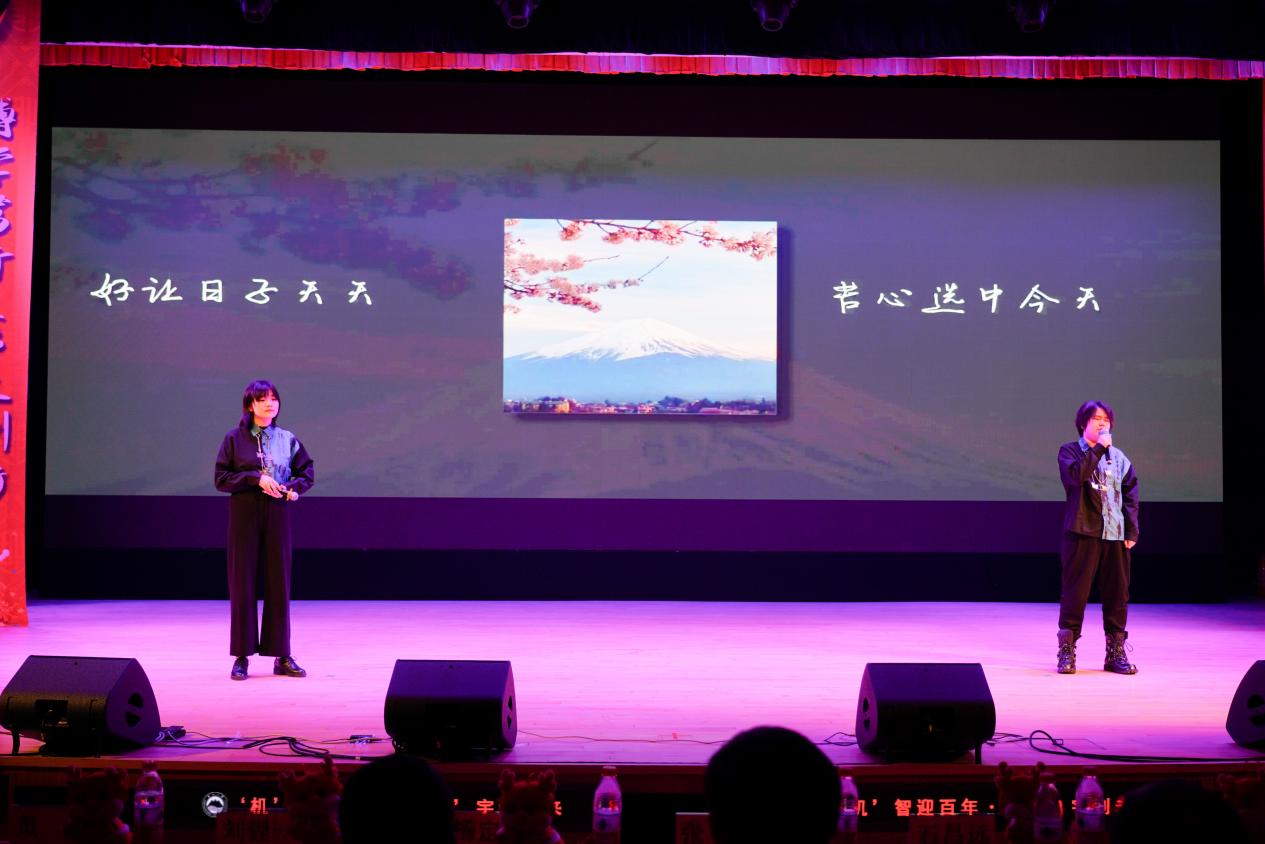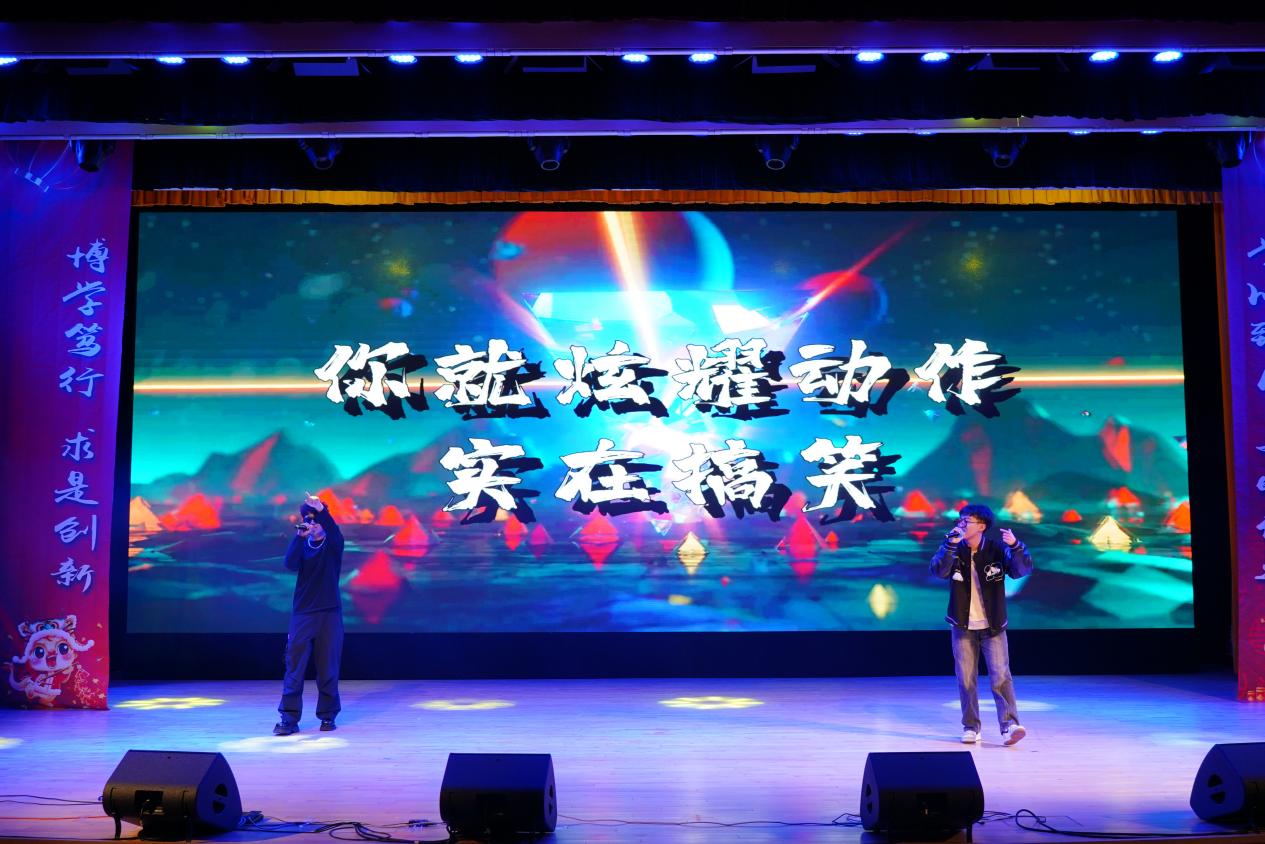 本次元旦晚会共分为“万里蹀躞,以此为归”、“揆诸当下,生命静听”、“芳华待灼,行而不辍”三篇章,共有师生表演的涵盖歌舞、乐器、语言12个节目,并设置抽奖环节。晚会在师生的欢声笑语中结束。