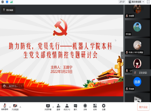 机器人科学与工程学院秉持大安全观,立足思想上重视、制度上健全、措施上管用、执行上有力的工作原则,建立健全安全识别化解机制。学院连续召开专项工作会议修订《机器人科学与工程学院学生疫情突发应急处置预案》,确保快速、有序、精准应对校园封闭管理期间学生可能发生的疫情事件。党旗映初心,引领有真情。学院在疫情暴发初期,成立疫情防控应急处置工作领导小组,组建以教工党员为核心的疫情防控专项先锋队和以学生干部、党员和积极分子为主体的疫情防控志愿者队伍,把战斗堡垒扎在防疫工作的最前沿,凝聚党员力量,激发党员活力,做到关键环节有组织,关键时刻有党员。