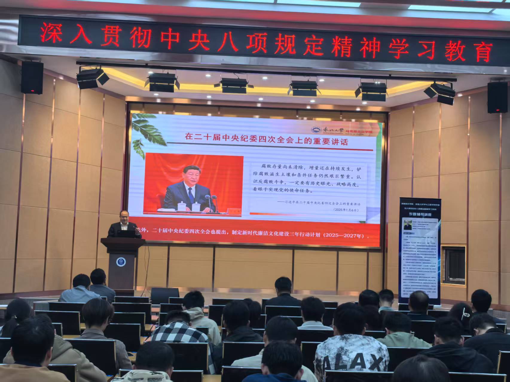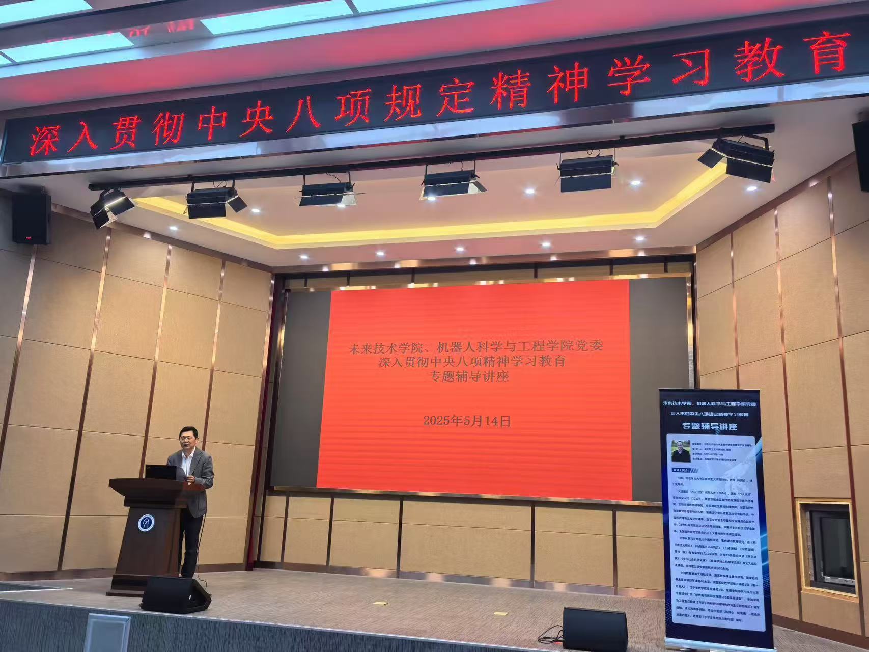 为扎实开展深入贯彻中央八项规定精神学习教育,5月14日下午,未来技术学院、机器人科学与工程学院党委在浑南校区文管学馆B230报告厅举办深入贯彻中央八项规定精神学习教育专题辅导报告会,邀请马克思主义学院院长任鹏教授作专题宣讲。本次报告会以“中国共产党传承发展中华优秀廉洁文化的经验”为主题,深入贯彻中央八项规定精神,强化党纪学习教育。学院党委书记贾同主持会议,学院领导班子成员、全体师生党员参加学习。